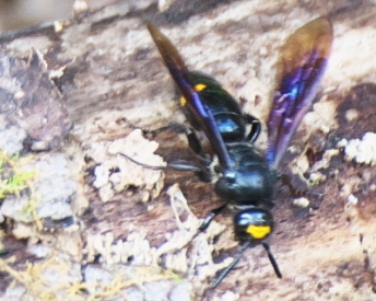 <ハチ目・ハチ亜目・スズメバチ上科・ツチバチ科・ナミツチバチ亜科・ナミツチバチ属> ![]() ツチバチ科ナミツチバチ属のハチで、在来種。 日本では、北海道から本州、四国、九州と対馬、大隈諸島、三宅島、奄美諸島以北の琉球列島に分布。 海外では、朝鮮半島から中国、アムール、台湾に分布する。 体長は、オスで15〜21mm、メスで20〜25mmである。体色は全体に黒色で、黒い短毛がある。 出現時期は7月〜9月で、クワガタムシ類の幼虫がいる雑木林や朽ち木のある場所にいる。 頭部は黒色で、前額に橙黄色の斑紋があるが、頭頂部まで拡がったり、離れたり、退化する個体もある。 腎形の複眼の中央に単眼があり、小楯板、後小楯板、前伸腹節には強い点刻がある。 腹部は黒色で強い光沢があり、腹部第3背板に1対の橙黄色の斑紋がある。翅は暗褐色で光沢がる。 見た目がキオビツチバチ(以降キオビと記す)に似ているが、本種の前額には橙黄色の斑紋があるのが特徴。 また、腹部の橙黄色の斑紋も、キオビのオスのようにつながったり、メスのように目玉模様にはならない。