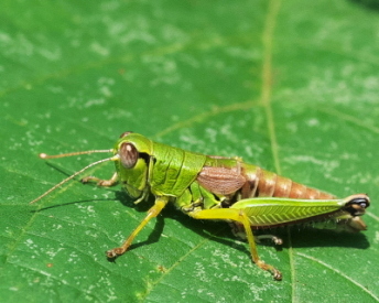 その湿地に生えているクサネムの葉に留まっていた、メスの終齢幼虫です。 2018/8/23 同じ駐車場の奥にある草原で、葛の葉に止まっていたオンブバッタのメスです。 不完全変態なので、翅の有無(正確には大きさや形態)以外は、あまり変化はありません。 | ||||