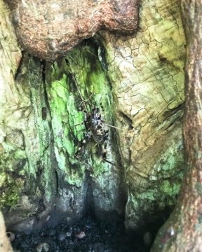 胎内星まつり会場から少し離れた芝生広場の側にある沼、その脇の樹で見かけました。 たまたま、スジクワガタを撮ったときにその周辺に写り込んでいたものです。 樹液の出ている場所の前に陣取るスジクワガタのメスの前で、様子を見ていました。 勝てる相手ではないので、他の場所の方へ移動していきました。