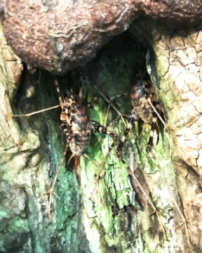 胎内星まつり会場下のテントサイトで、早朝、ボックスの上にいたハヤシノウマオイです。 寝る前に鳴き声は聞こえませんでしたし、車中泊でしたので、夜間に鳴いていたかどうかも不明です。 まだ、ウマオイの泣き声は聞いたことがないので、聞きたかったです。 なお、オスの発音器の左側(右写真では上側)の黒条の形が尖っているので、ハヤシノウマオイですね。