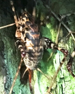 ![]() 2025/8/24 奥胎内ヒュッテを散策して戻る際、道路脇でアシグロツユムシの幼虫を見かけました。 ただ、見たときには何の幼虫か分からず、後でいろいろな幼虫を比較して本種と分かりました。 何匹かいたのですが、その内の1匹は脱皮直後で、自分の脱皮殻を食べている最中でした(下段)。 幼虫が脱皮殻を食べるのは、殻に含まれるタンパク質や脂肪などの栄養素を回収するのが1つの目的です。 | ||||