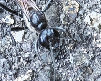 只見線沿いの福田新田休息所で、近くの鉄橋を渡る列車を撮ろうと待っているときに見かけました。 体形からトックリバチであろうと思ったのですが、後で調べると黄斑などが異なります。 改めて調べ直し、ミカドトックリバチのオス(胸部背に1対の黄斑がない)と分かりました。 | ||||