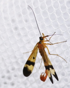 <ハチ目・ハチ亜目・ヒメバチ上科・ヒメバチ科> ![]() ヒメバチ科は甲虫や他のハチ、チョウ、クモなどを寄主として利用する捕食寄生者である。 陸域生態系において他の昆虫を中心とした節足動物の個体数を制御する重要な役割を担っている。 昆虫の中でも特に巨大なグループであり、世界から約25,000種が知られている。 ヒメバチは細身のハチのような体型をしているが、その体長、体色、体型などは非常に多様である。 他の膜翅目昆虫に比べて触角の節数が多いという特徴があり、触角は普通16節以上ある。 寄主に産卵するため、多くのヒメバチのメスは、腹端から突出した長い産卵管を持っている。 ヒメバチの仲間は全世界に分布し、約1,600属25,000種が含まれている。