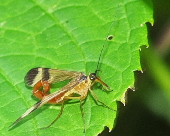 星まつり会場から少し離れた芝生広場、その周りを散歩中に見かけたものです。 オトコエシの花に止まっていた所を撮り、アングルを変えようとしたときに飛ばれてしまいました。 その後は止まることなく飛び去って行ったので、この2ショットのみとなりました。 このヒメバチ科は数が多く、似たものも多いので、同定には至っていません。 ただ、特徴的にはヒメバチ科の1亜科であるコンボウアメバチ亜科の1種ではないかと思っています。 | ||||